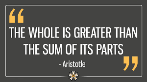 The sum of its parts. Read my exploration into that topic The phrase is also used to explain the importance of Synergy and the foundations of Gestalt theory. The meaning of the whole is greater than the sum of its parts is that when one single thing is grouped by a collection of individual parts and properties it will be fairer more beautiful or more perfect than any of the parts would be on their own. Related to the idea that the total effectiveness of a group of things each interacting with one another is different or greater than their effectiveness when acting in isolation from one another.