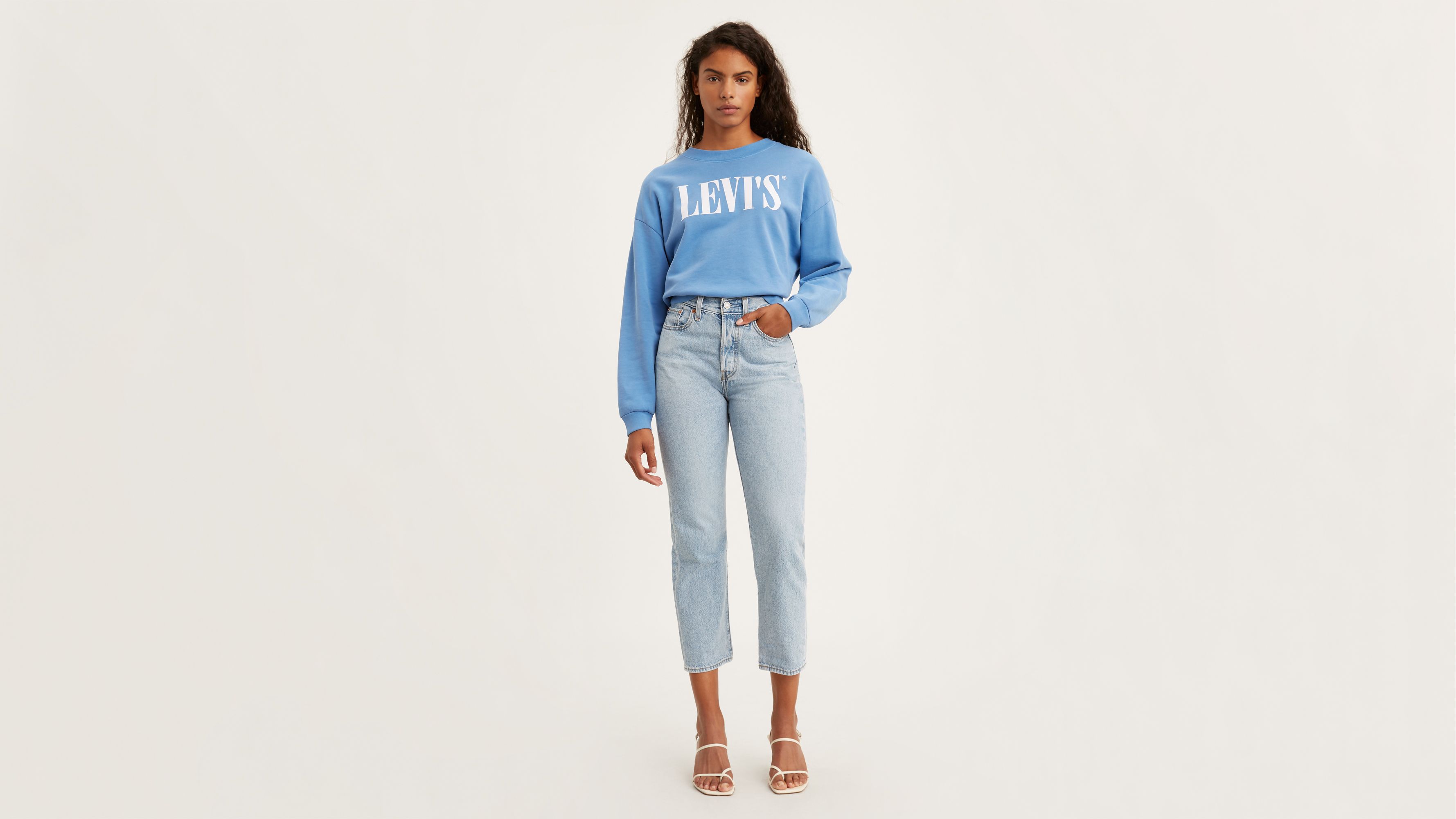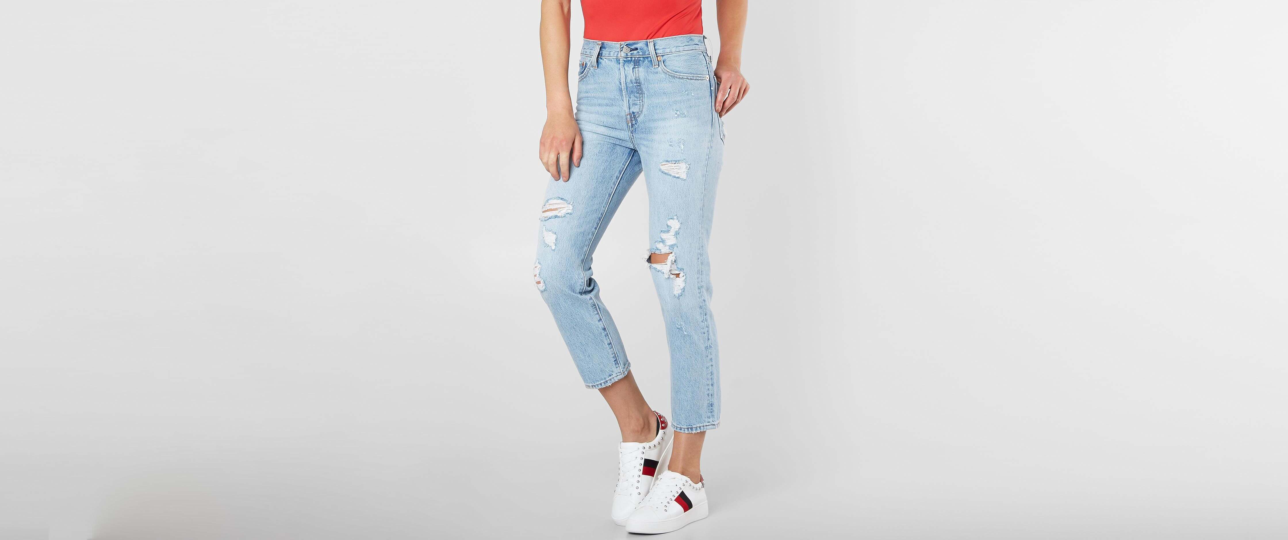 Made from a stretch fabric these straight leg jeans feature a high-rise fit 4-button front closure raw cut release hem and a classic 5-pocket body. A faded wash and shredded detailing add a cool vintage vibe to the cropped style. Shop Womens Levis Blue Size 31 Straight Leg at a discounted price at Poshmark.
