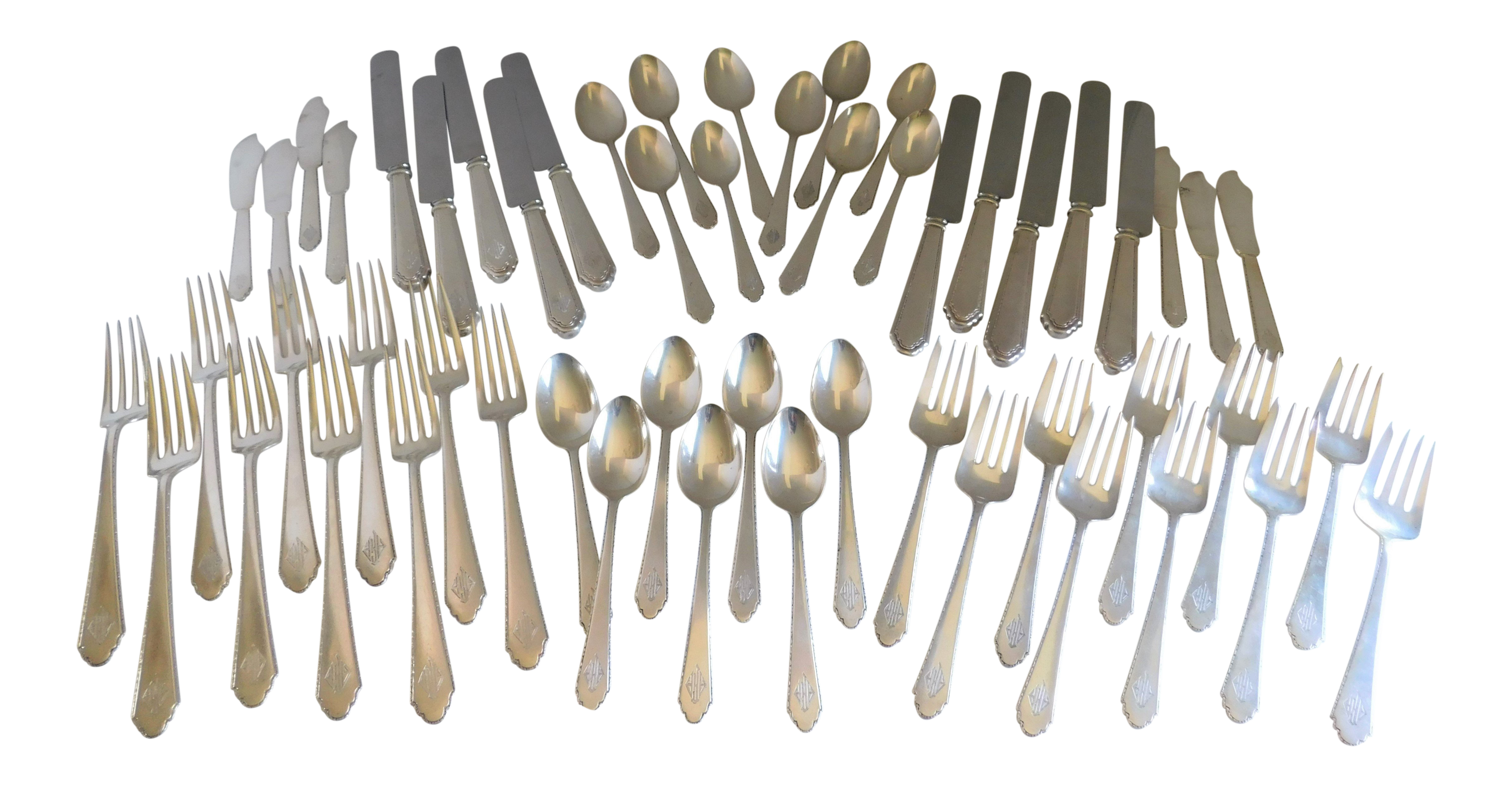 64pc Treasure Sterling Silver Flatware Set. This gorgeous sterling silver pattern features a delicate scroll design that complements. This beautiful collection features seventy-one sterling pieces in total including ten cutlery knives ten dinner forks twelve salad forks thirteen teaspoons ten coffee spoons seven butter knives two large serving spoons serving.